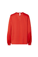 Блузка женская прямого силуэта. В верхней части переда обработана «складка-драпировка». В верхней части спинки обработан разрез с застежкой на 1 петлю и пуговицу. Рукав втачной, с притачной манжетой. Застёжка манжеты на петлю и пуговицу.