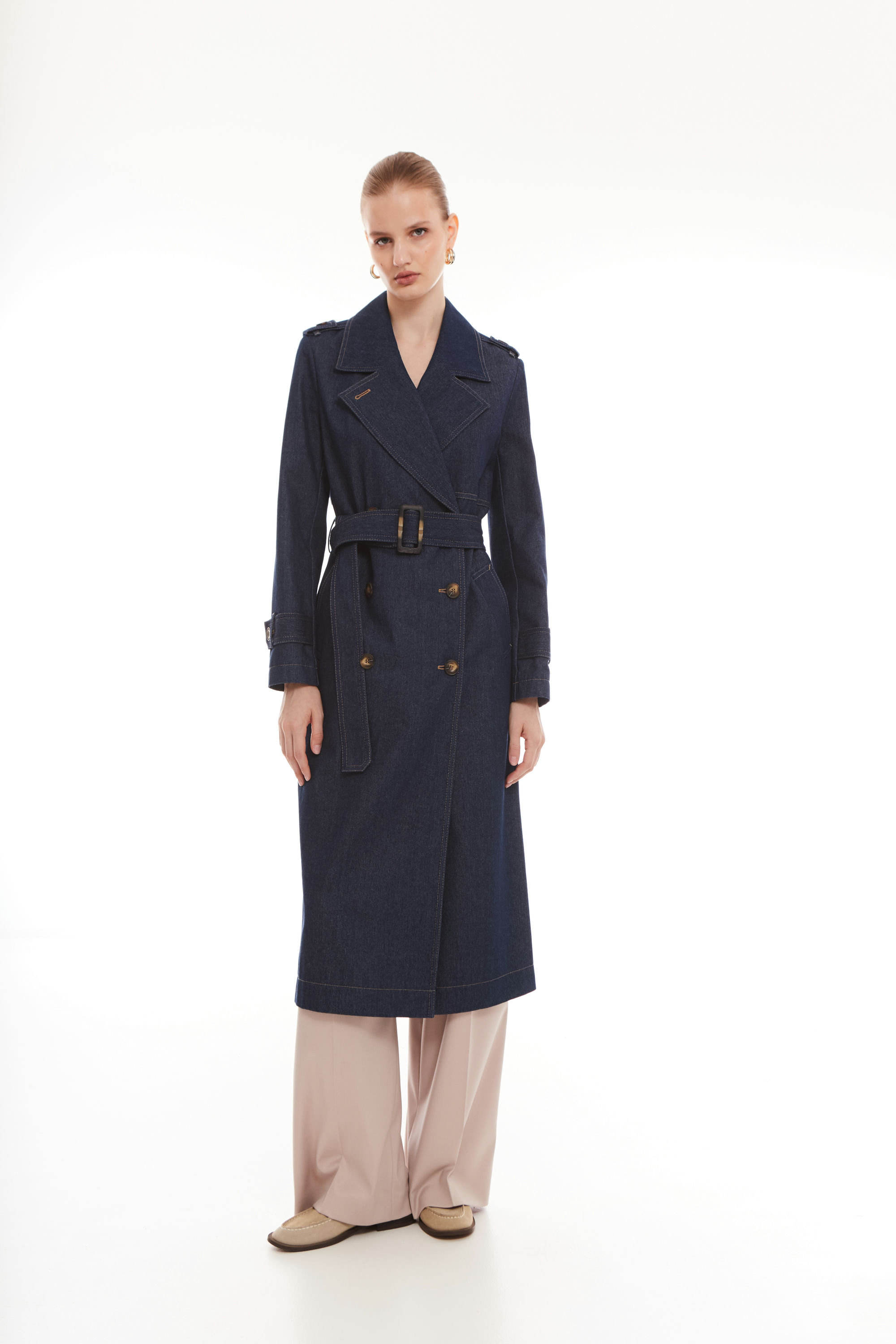 Плащ женский, двубортный, длиной «миди», без подкладки. Застежка на петли и пуговицы. На спинке отлетная кокетка, в нижней части среднего шва шлица. На переде карман- листочка с втачными концами. Рукав длинный, втачной, по низу пата пристегивающаяся на петлю и пуговицу. Воротник и лацкана отложные. По плечам погоны. В комплекте пояс.