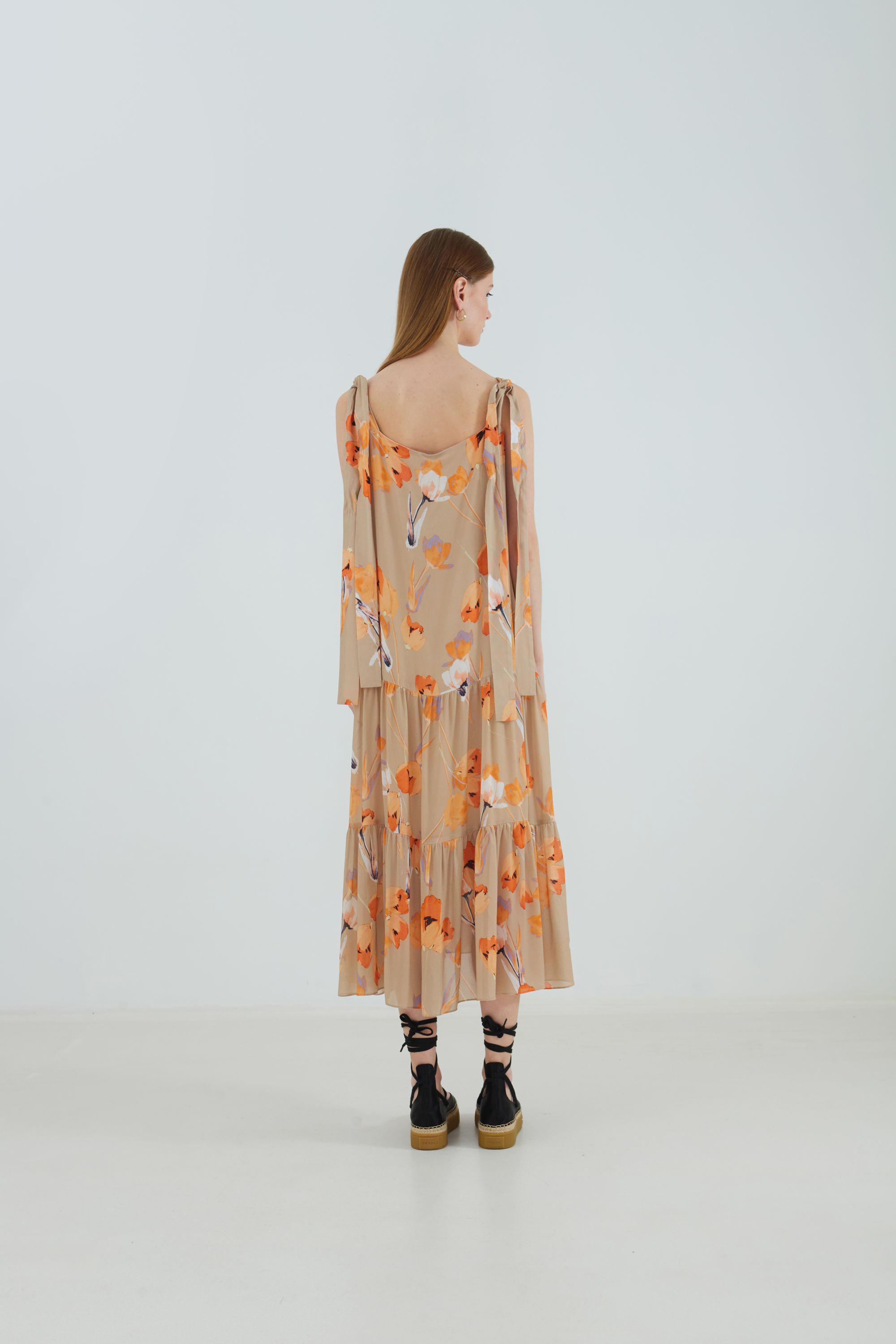 Платье женское, расширенное книзу, длинное. Нижняя часть переда и спинки с притачными воланами на сборке. По переду и спинке притачные бретели – завязки. Бретели – завязки фиксируются узлом.