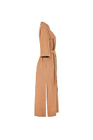 Платье женское А-силуэта, длина «миди». По переду планка застёгивается на петли и пуговицы. Перед и спинка в верхней части с отрезной кокеткой: в шве притачивания кокетки переда - клапана, застегивающиеся на петлю и пуговицу. В шве притачивания кокетки спинки - встречная складка. Карманы в боковых швах. В нижней части боковых швов разрезы. Воротник рубашечного типа. Рукав втачной длиной ¾. В комплекте съемный пояс.