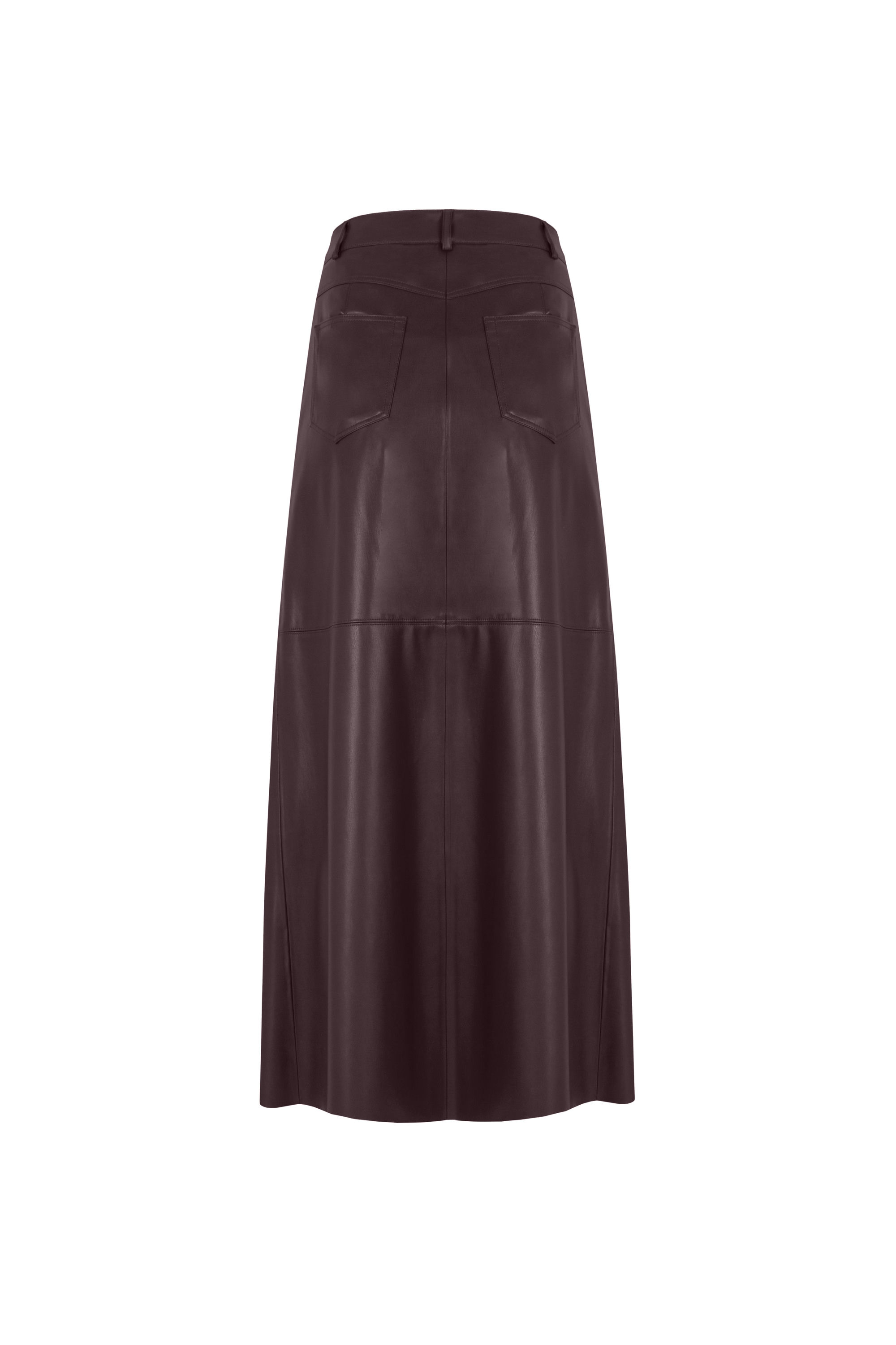Юбка женская, расширенная к низу, длиной «миди», с открытым срезом по низу. Перед с отрезной планкой с застежкой на тесьму-молния. По боковым швам наклонные карманы. Заднее полотнище юбки с кокеткой и накладными карманами. По переднему и заднему полотнищам поперечный рельеф с отделочными строчками. Пояс со шлевками, застегивающийся на 3 пробивные кнопки.