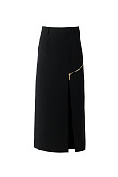 Юбка женская, на подкладке, зауженная к низу, длиной «миди». Передняя часть юбки с разрезом и декоративной молнией, которая переходит на спинку. Спинка со средним швом. Юбка застегивается на потайную молнию в левом боковом шве. Верхний срез юбки обработан притачным поясам.