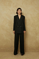Жакет женский прямого силуэта, двубортный, на подкладке. На переде карманы с клапаном и на левом переде верхний-листочка, застежка на петли и пуговицы. Спинка с отлетной шлицей. Рукава длинные, двухшовные, в нижней части локтевого шва отлетная шлица на 4 петли и пуговицы. Воротник и лацкана отложные. По воротнику, клапанам, среднему шву спинки, локтевым швам рукавов, лацканам и бортам отделочная строчка – иммитация ручного стежка.