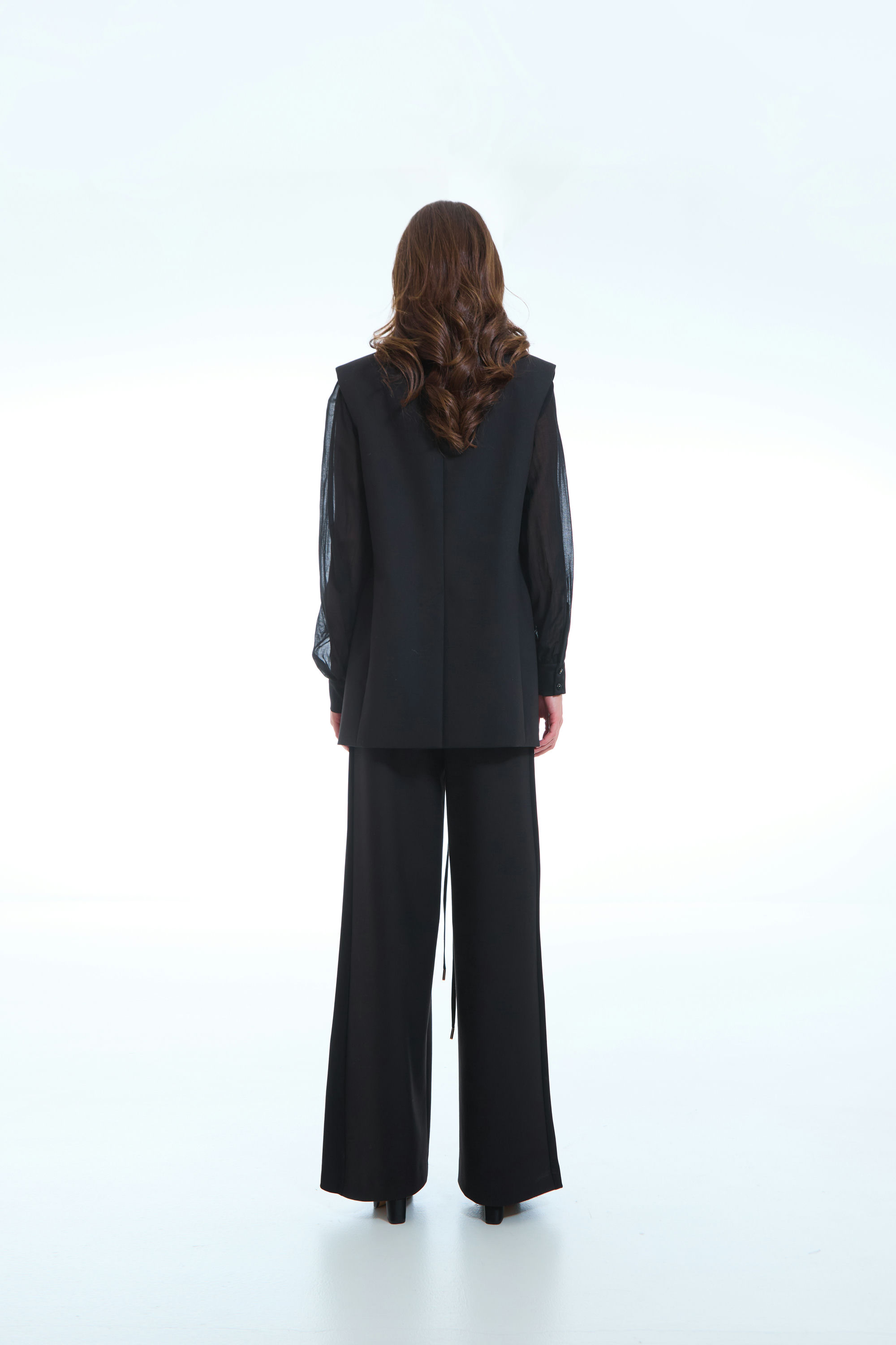 Особое внимание стоит обратить на шлицу в нижней части среднего шва спинки, которая обеспечивает свободу движений и удобство. Передняя часть жилета украшена карманами в рамку с клапанами, а также нагрудным карманом с листочкой на левом переде, что добавляет изделию утончённый и стильный акцент. Отложной воротник и лацканы завершают образ, создавая классическую деталь, идеально подходящую как для деловых, так и для повседневных комплектов. Этот жилет станет прекрасным дополнением к любому наряду, подчеркивая ваш безупречный вкус.